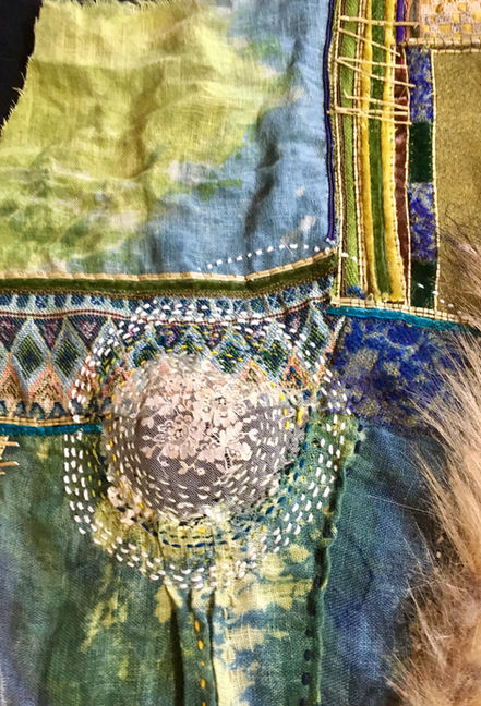ou teintés avec des végétaux du jardin, collés, puis cousus, déchirés, brodés, repeints, et dans lesquels s'entremêlent des dentelles anciennes, des plumes, des végétaux séchés, du métal, de la feuille d'or...